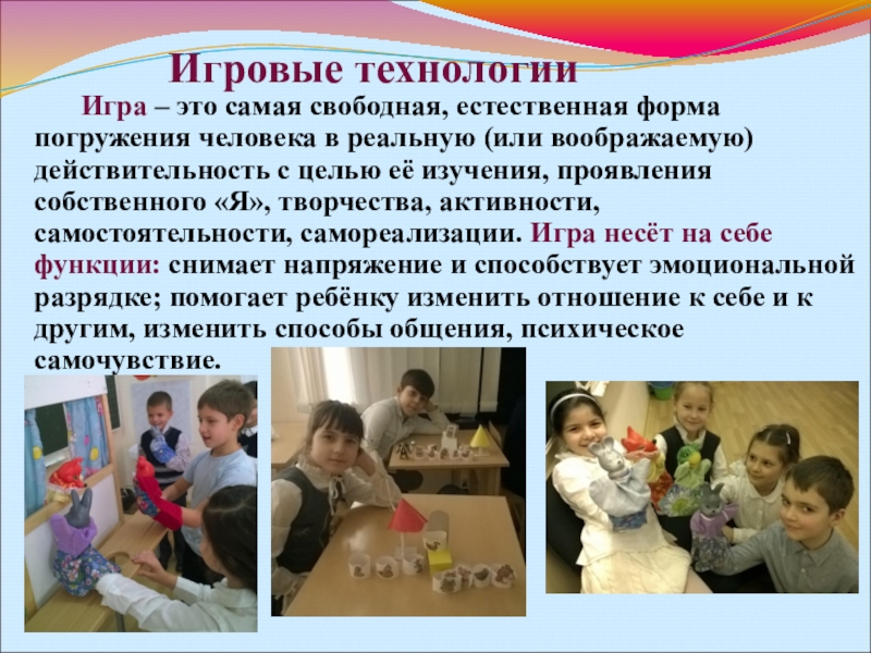 свободная, естественная форма погружения человека в реальную (или воображаемую) действительность с целью её изучения, проявления собственного «Я», творчества, активности, самостоятельности, самореализации. Игра несёт на себе функции: снимает напряжение и способствует эмоциональной разрядке; помогает ребёнку изменить отношение к себе и к другим, изменить способы общения, психическое самочувствие.