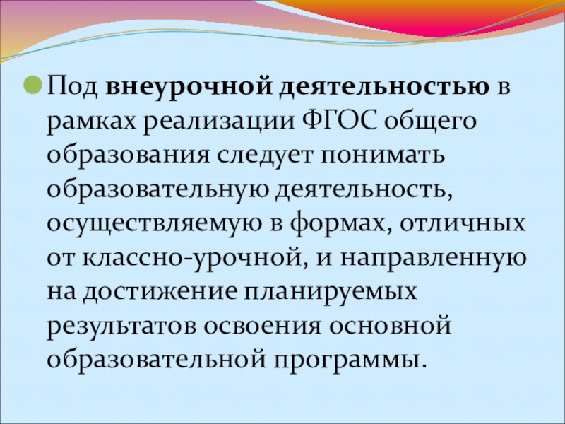 Слайд 3Под внеурочной деятельностью в рамках реализации ФГОС общего образования следует понимать