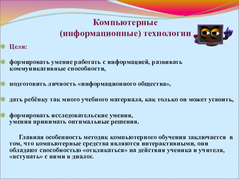 Главная особенность методик компьютерного обучения заключается в том, что компьютерные средства являются интерактивными, они обладают способностью «откликаться» на действия ученика и учителя, «вступать» с ними в диалог.