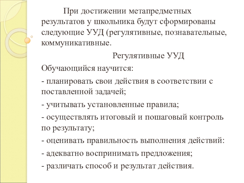 Слайд 4 При достижении метапредметных результатов у школьника