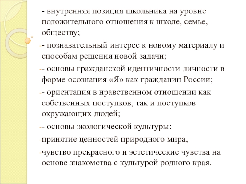 Слайд 3- внутренняя позиция школьника на уровне положительного отношения к школе, семье,