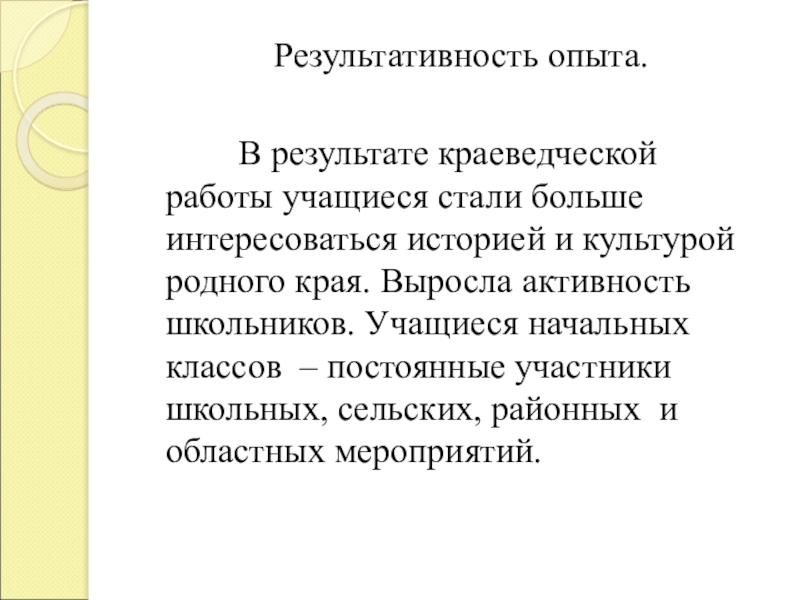 В результате краеведческой работы учащиеся стали больше интересоваться историей и культурой родного края. Выросла активность школьников. Учащиеся начальных классов – постоянные участники школьных, сельских, районных и областных мероприятий.
