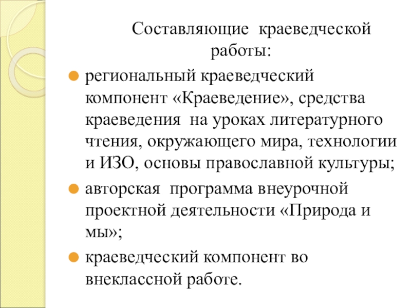 Слайд 25 Составляющие краеведческой работы: