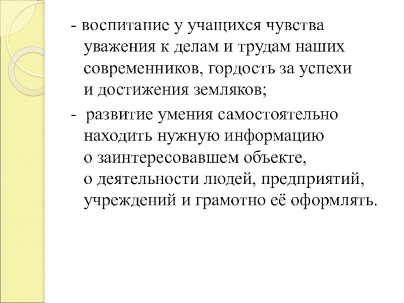 Слайд 24- воспитание у учащихся чувства уважения к делам и трудам наших современников, гордость за успехи