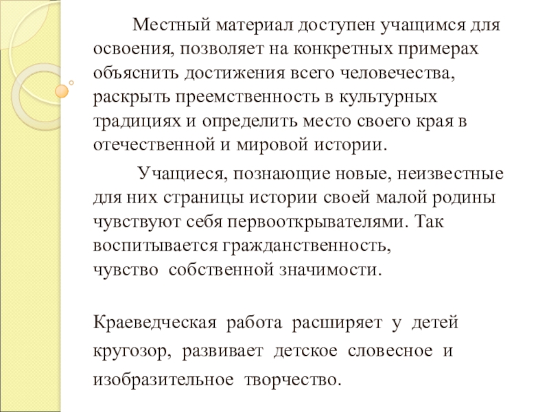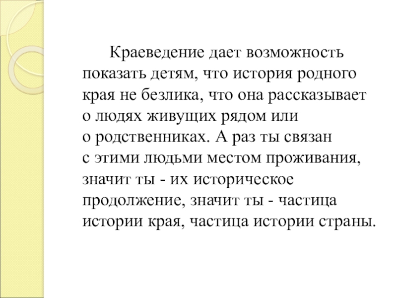 Краеведение дает возможность показать детям, что история родного края не безлика, что она рассказывает о людях живущих рядом или о родственниках. А раз ты связан с этими людьми местом проживания, значит ты - их историческое продолжение, значит ты - частица истории края, частица истории страны.