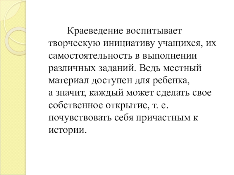 Краеведение воспитывает творческую инициативу учащихся, их самостоятельность в выполнении различных заданий. Ведь местный материал доступен для ребенка, а значит, каждый может сделать свое собственное открытие, т. е. почувствовать себя причастным к истории.