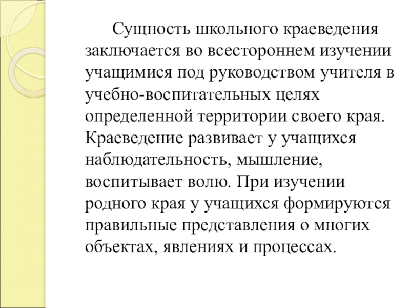 всестороннем изучении учащимися под руководством учителя в учебно-воспитательных целях определенной территории своего края. Краеведение развивает у учащихся наблюдательность, мышление, воспитывает волю. При изучении родного края у учащихся формируются правильные представления о многих объектах, явлениях и процессах.
