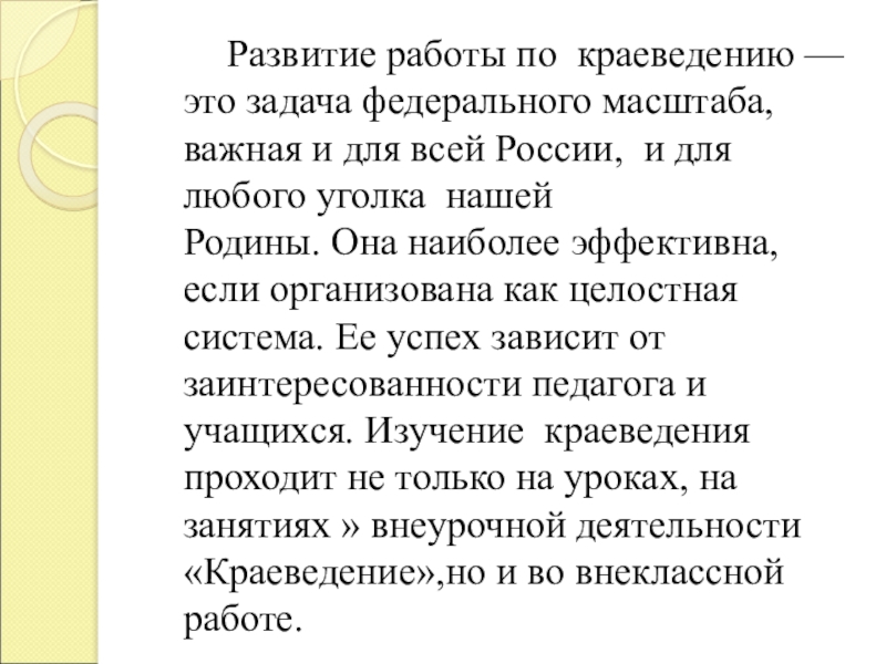 федерального масштаба, важная и для всей России, и для любого уголка нашей Родины. Она наиболее эффективна, если организована как целостная система. Ее успех зависит от заинтересованности педагога и учащихся. Изучение краеведения проходит не только на уроках, на занятиях » внеурочной деятельности «Краеведение»,но и во внеклассной работе.
