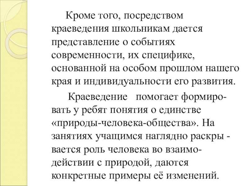 Краеведение помогает формиро- вать у ребят понятия о единстве «природы-человека-общества». На занятиях учащимся наглядно раскры -вается роль человека во взаимо-действии с природой, даются конкретные примеры её изменений.