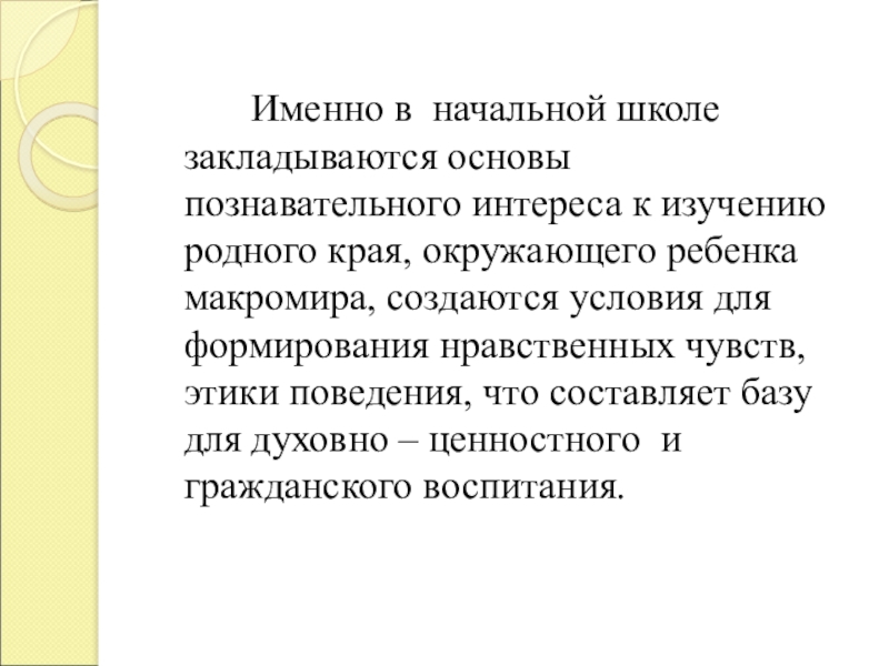 Именно в начальной школе закладываются основы познавательного интереса к изучению родного края, окружающего ребенка макромира, создаются условия для формирования нравственных чувств, этики поведения, что составляет базу для духовно – ценностного и гражданского воспитания.