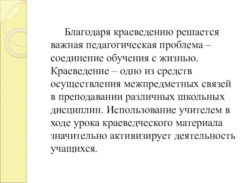 краеведению решается важная педагогическая проблема – соединение обучения с жизнью. Краеведение – одно из средств осуществления межпредметных связей в преподавании различных школьных дисциплин. Использование учителем в ходе урока краеведческого материала значительно активизирует деятельность учащихся.
