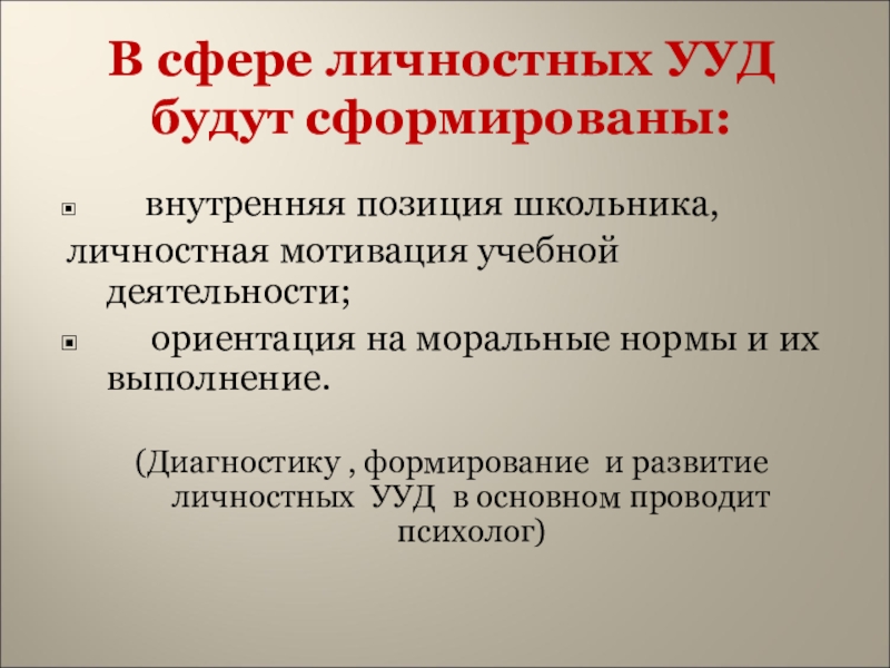(Диагностику , формирование и развитие личностных УУД в основном проводит психолог)
