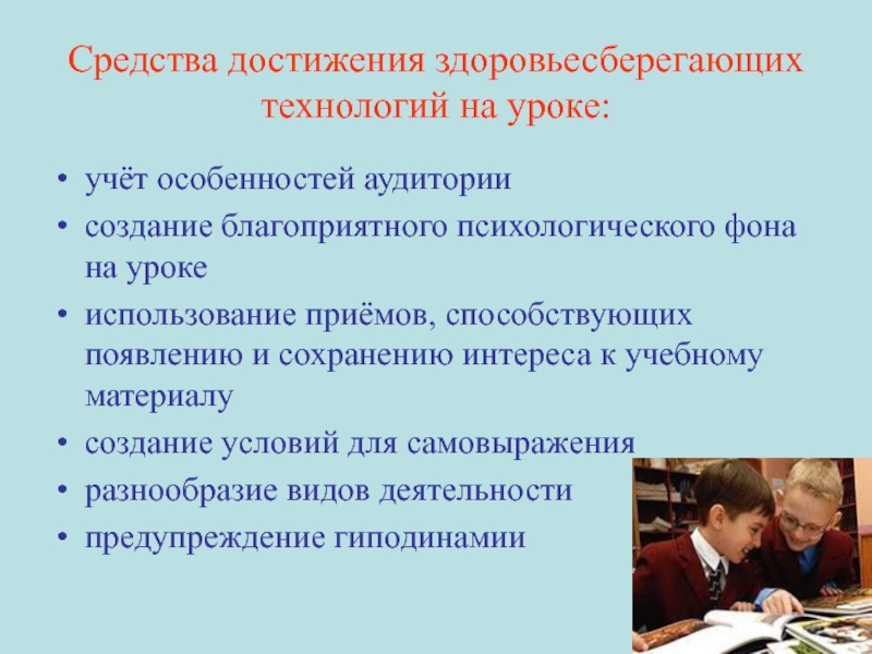 Слайд 15Средства достижения здоровьесберегающих технологий на уроке: