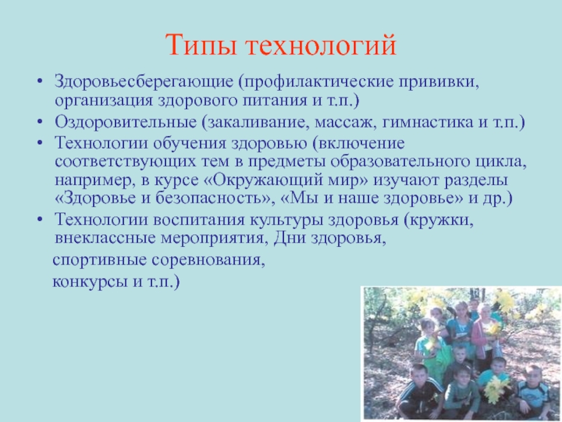 Технологии воспитания культуры здоровья (кружки, внеклассные мероприятия, Дни здоровья,