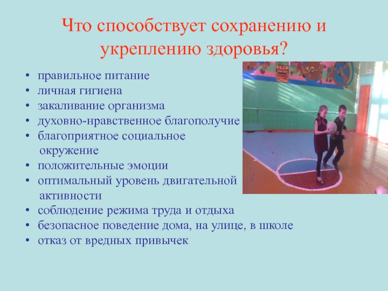 Слайд 10Что способствует сохранению и укреплению здоровья?