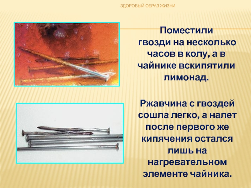Ржавчина с гвоздей сошла легко, а налет после первого же кипячения остался лишь на нагревательном элементе чайника.