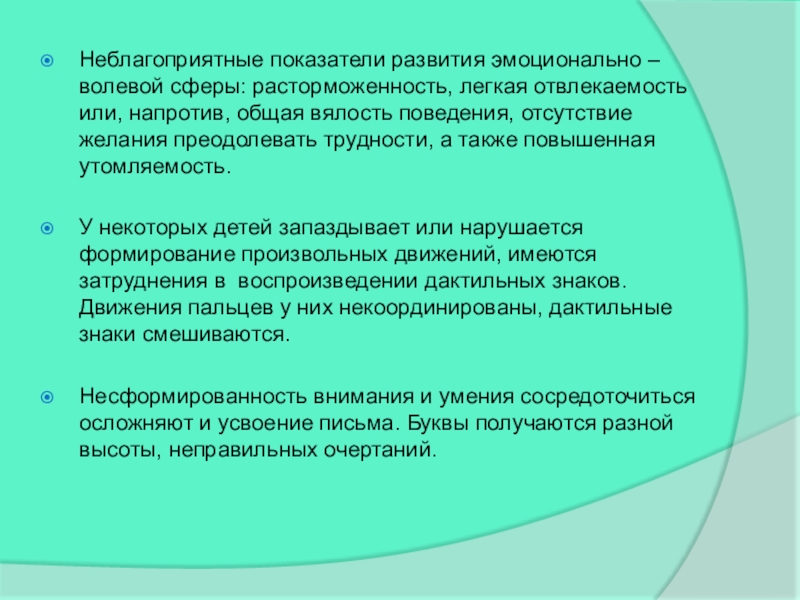 Слайд 10Неблагоприятные показатели развития эмоционально – волевой сферы: расторможенность, легкая отвлекаемость или,