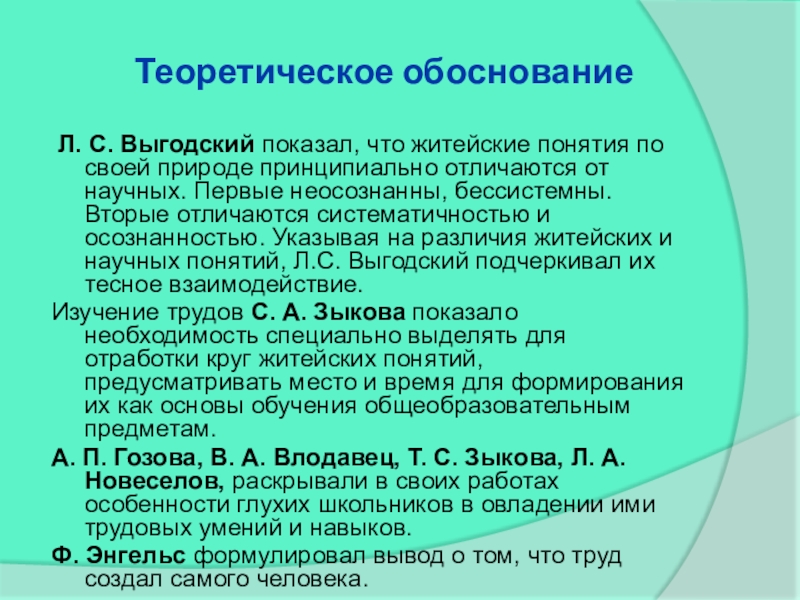 Изучение трудов С. А. Зыкова показало необходимость специально выделять для отработки круг житейских понятий, предусматривать место и время для формирования их как основы обучения общеобразовательным предметам.