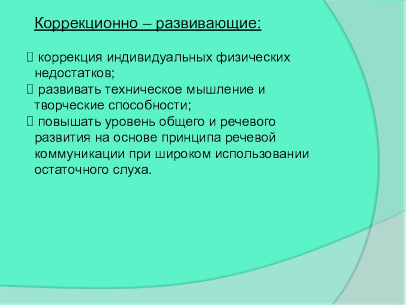 повышать уровень общего и речевого развития на основе принципа речевой коммуникации при широком использовании остаточного слуха.