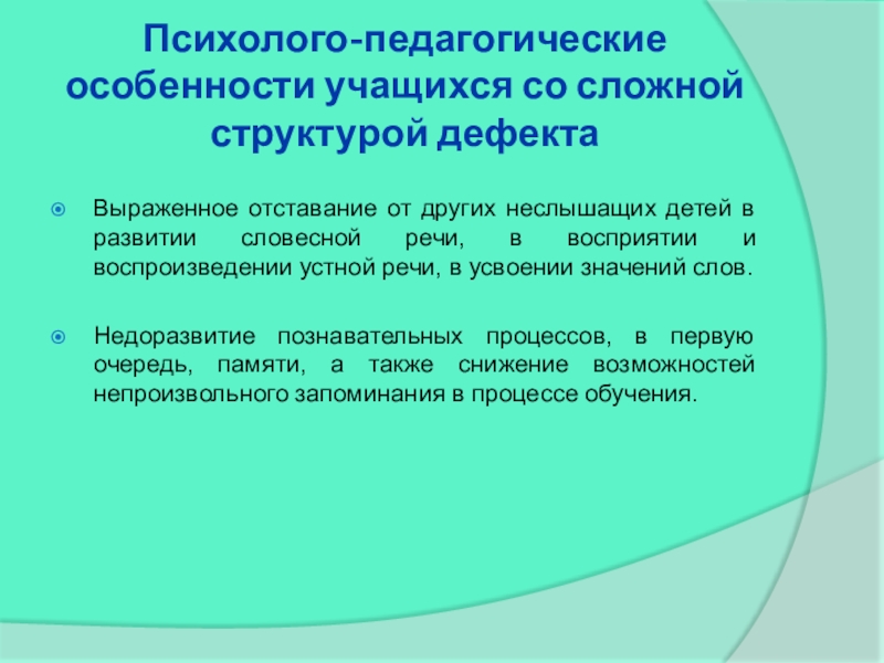 Слайд 9Психолого-педагогические особенности учащихся со сложной структурой дефекта