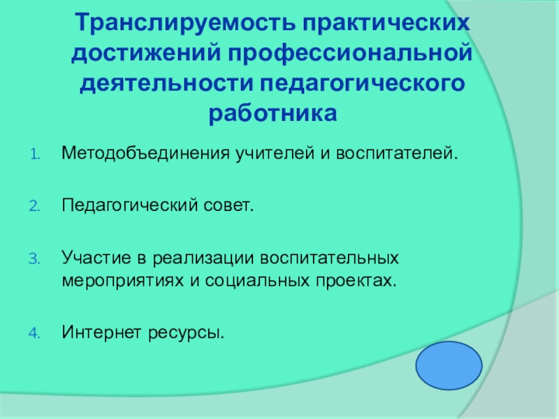 Слайд 23Транслируемость практических достижений профессиональной деятельности педагогического работника