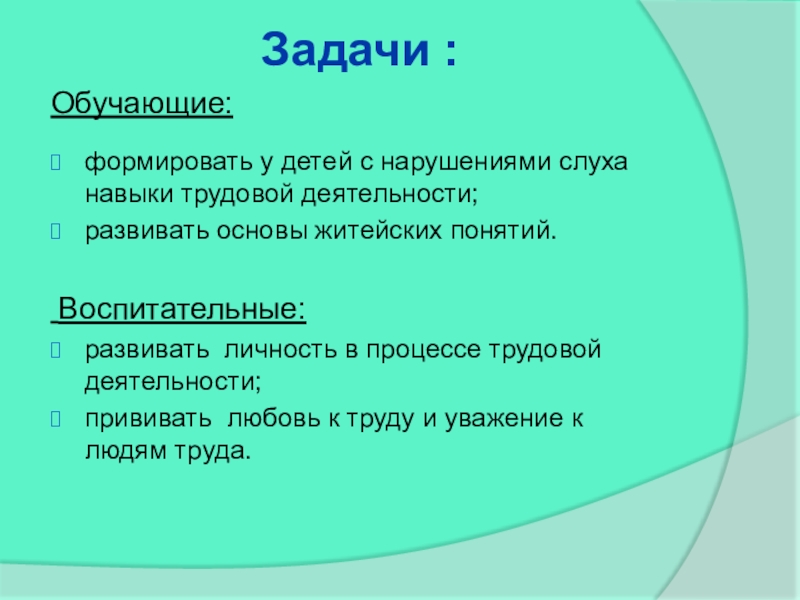 формировать у детей с нарушениями слуха навыки трудовой деятельности;