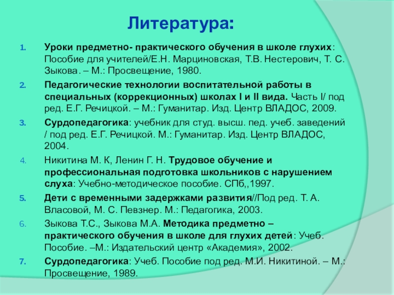 Зыкова Т.С., Зыкова М.А. Методика предметно – практического обучения в школе для глухих детей: Учеб. Пособие. –М.: Издательский центр «Академия», 2002.