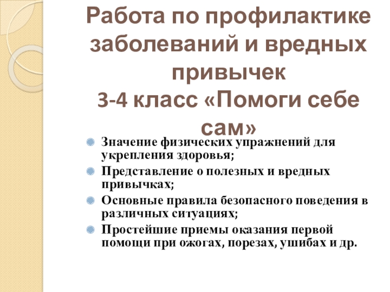 Слайд 10Работа по профилактике заболеваний и вредных привычек 3-4 класс «Помоги себе сам»