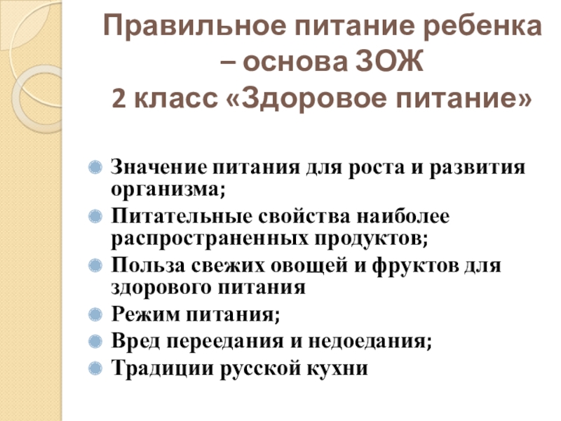 Правильное питание ребенка – основа ЗОЖ 2 класс «Здоровое питание» Значение питания для роста и развития организма;Питательные