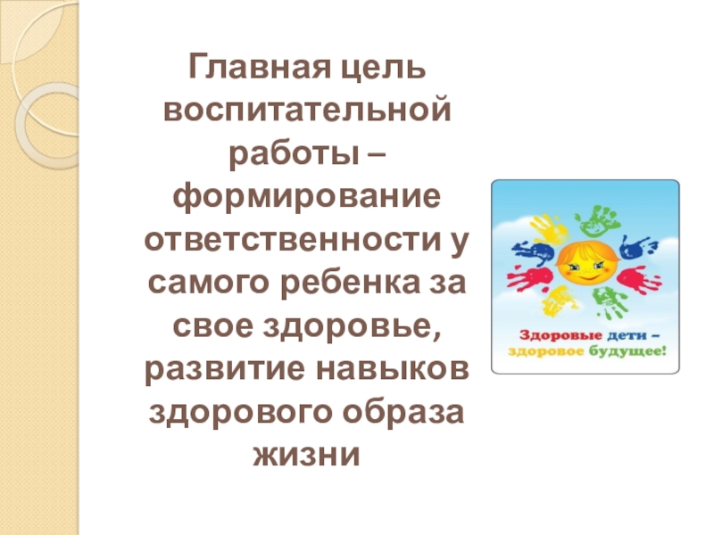 Главная цель воспитательной работы – формирование ответственности у самого ребенка за свое здоровье, развитие навыков здорового образа жизни