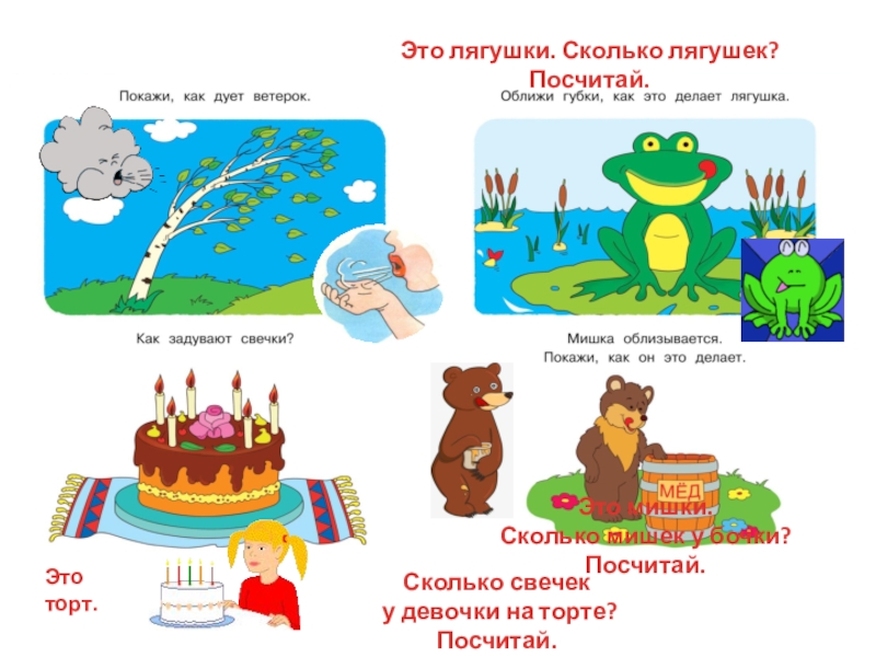 Это лягушки. Сколько лягушек? Посчитай.