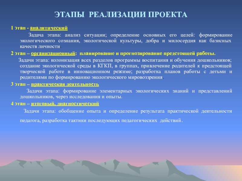 Задачи этапа: колонизация всех разделов программы воспитания и обучения дошкольников; создание экологической среды в КГКП, в группах, привлечение родителей к предстоящей творческой работе в инновационном режиме; разработка планов работы с детьми и родителями по формированию экологического мировоззрения.