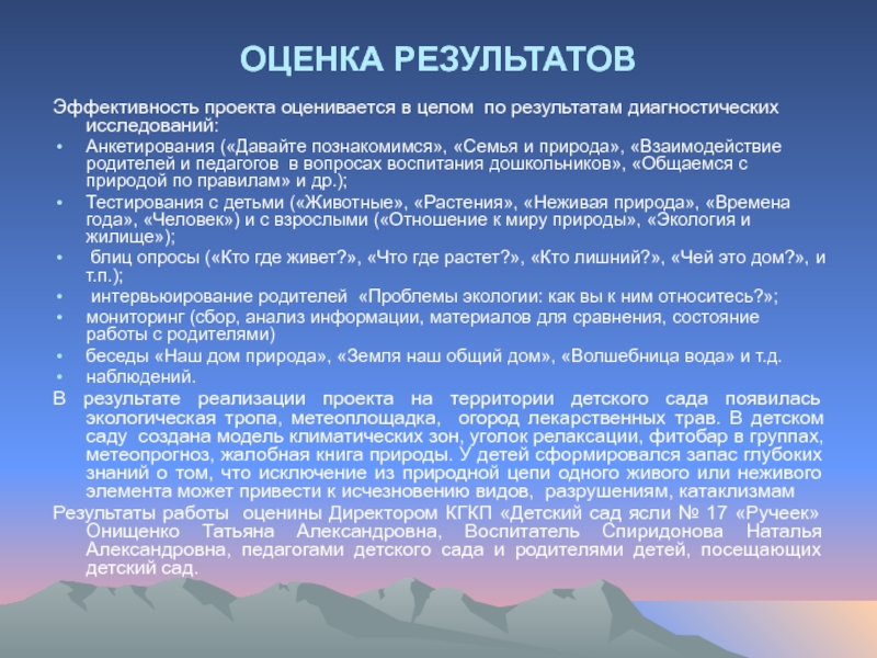 Результаты работы оценины Директором КГКП «Детский сад ясли № 17 «Ручеек» Онищенко Татьяна Александровна, Воспитатель Спиридонова Наталья Александровна, педагогами детского сада и родителями детей, посещающих детский сад.
