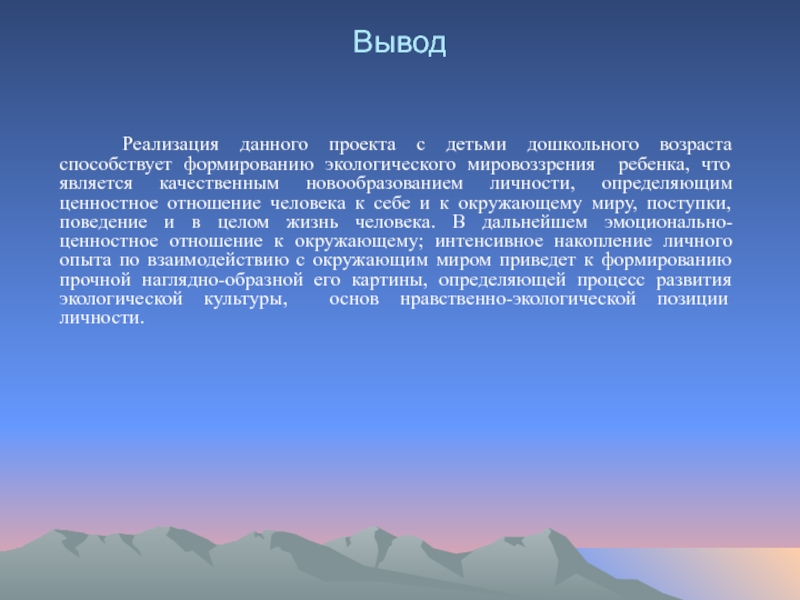 формированию экологического мировоззрения ребенка, что является качественным новообразованием личности, определяющим ценностное отношение человека к себе и к окружающему миру, поступки, поведение и в целом жизнь человека. В дальнейшем эмоционально-ценностное отношение к окружающему; интенсивное накопление личного опыта по взаимодействию с окружающим миром приведет к формированию прочной наглядно-образной его картины, определяющей процесс развития экологической культуры, основ нравственно-экологической позиции личности.