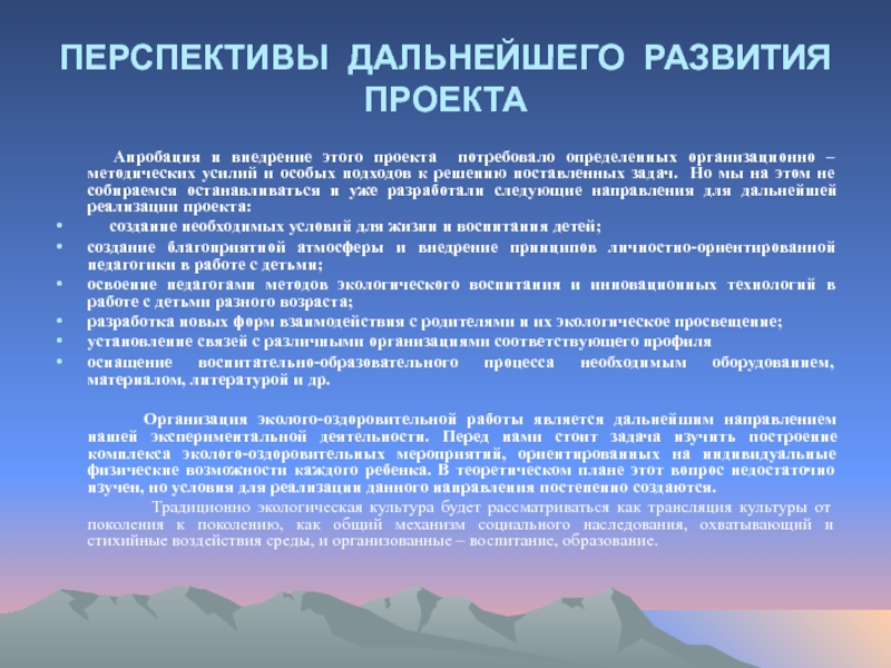 Организация эколого-оздоровительной работы является дальнейшим направлением нашей экспериментальной деятельности. Перед нами стоит задача изучить построение комплекса эколого-оздоровительных мероприятий, ориентированных на индивидуальные физические возможности каждого ребенка. В теоретическом плане этот вопрос недостаточно изучен, но условия для реализации данного направления постепенно создаются.