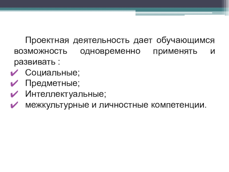 Слайд 3Проектная деятельность дает обучающимся возможность одновременно применять и развивать :
