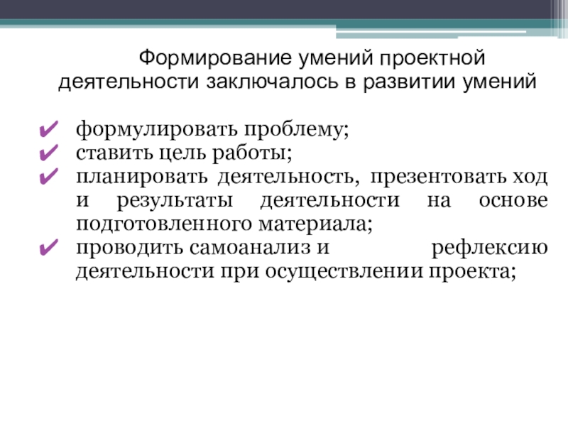 Слайд 30Формирование умений проектной деятельности заключалось в развитии умений