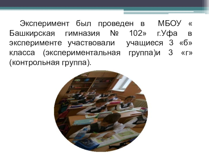 Слайд 19Эксперимент был проведен в МБОУ « Башкирская гимназия № 102» г.Уфа