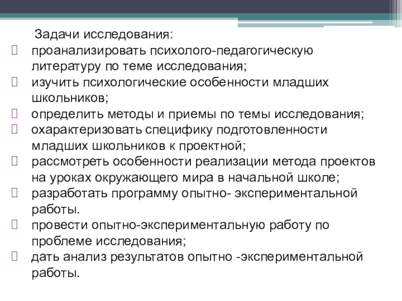 Слайд 7Цель исследования: теоретически обосновать особенности формирования проектной деятельности младших школьников на