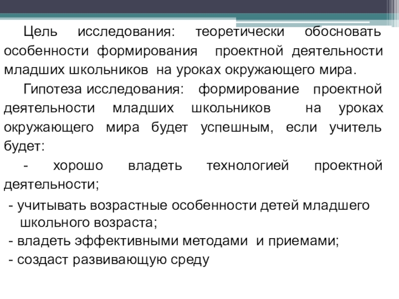 Гипотеза исследования: формирование проектной деятельности младших школьников на уроках окружающего мира будет успешным, если учитель будет: