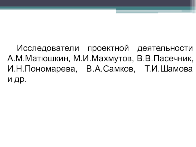 Исследователи проектной деятельности А.М.Матюшкин, М.И.Махмутов, В.В.Пасечник, И.Н.Пономарева, В.А.Самков, Т.И.Шамова