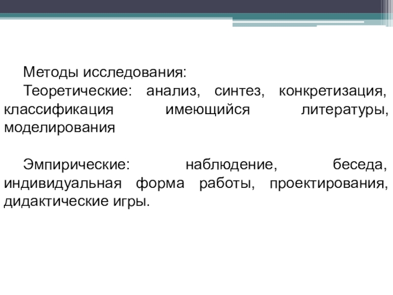 Теоретические: анализ, синтез, конкретизация, классификация имеющийся литературы, моделирования