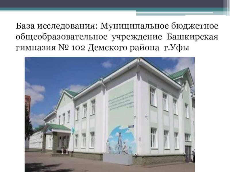 Слайд 10База исследования: Муниципальное бюджетное общеобразовательное учреждение Башкирская гимназия № 102 Демского