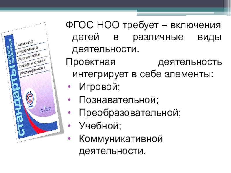 Слайд 4ФГОС НОО требует – включения детей в различные виды деятельности.
