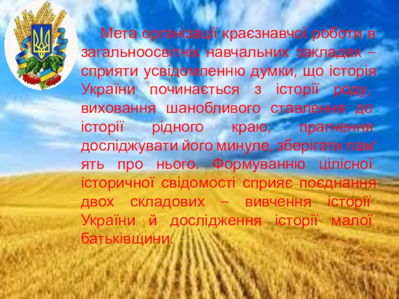 думки, що історія України починається з історії роду, виховання шанобливого ставлення до історії рідного краю, прагнення досліджувати його минуле, зберігати пам’ять про нього. Формуванню цілісної історичної свідомості сприяє поєднання двох складових – вивчення історії України й дослідження історії малої батьківщини.