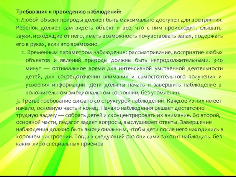 2. Временным параметром наблюдения: рассматривание, восприятие любых объектов и явлений природы должны быть непродолжительными. 3-10 минут — оптимальное время для интенсивной умственной деятельности детей, для сосредоточения внимания и самостоятельного получения и усвоения информации. Дети должны начать и завершить наблюдение в положительном эмоциональном состоянии, без утомления.