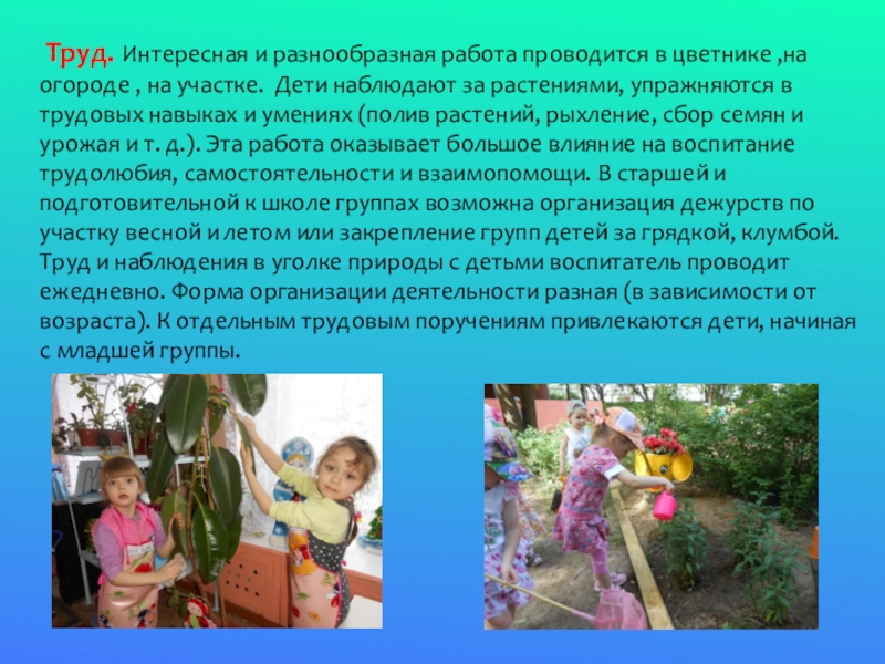 , на участке. Дети наблюдают за растениями, упражняются в трудовых навыках и умениях (полив растений, рыхление, сбор семян и урожая и т. д.). Эта работа оказывает большое влияние на воспитание трудолюбия, самостоятельности и взаимопомощи. В старшей и подготовительной к школе группах возможна организация дежурств по участку весной и летом или закрепление групп детей за грядкой, клумбой. Труд и наблюдения в уголке природы с детьми воспитатель проводит ежедневно. Форма организации деятельности разная (в зависимости от возраста). К отдельным трудовым поручениям привлекаются дети, начиная с младшей группы.