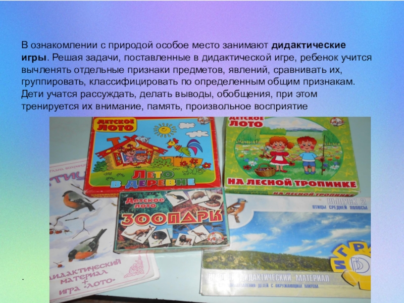 Слайд 12В ознакомлении с природой особое место занимают дидактические игры. Решая задачи, поставленные