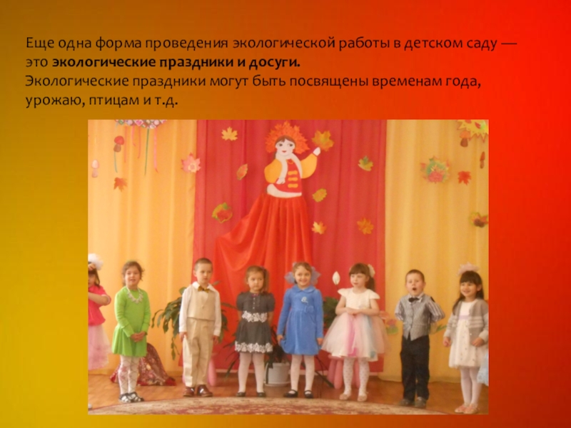Слайд 10Еще одна форма проведения экологической работы в детском саду — это экологические