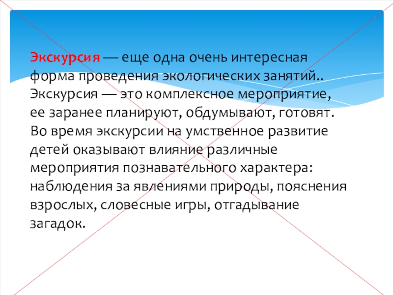 — это комплексное мероприятие, ее заранее планируют, обдумывают, готовят. Во время экскурсии на умственное развитие детей оказывают влияние различные мероприятия познавательного характера: наблюдения за явлениями природы, пояснения взрослых, словесные игры, отгадывание загадок.
